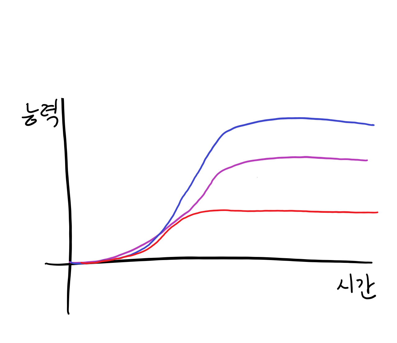 그 강연을 들었을때가 아마 딱 2년 차를 접어들었을 때였을 겁니다. 그리고 다시 2년이 지나 4년 차가 되었습니다. 앞으로 저는 4년 차와 5년 차 딱 2년이라는 시간이 남아있습니다. 그럼 과연 지금 저는 위 그래프에서 어디쯤 위치하고 있을까요? 냉정하게보면 빨강과 보라색 중간쯤 있을 거 같습니다. 물론 나름 2년 차 3년 차를 열심히 했다고는 생각하지만 부족한 게 많은 것이 현실입니다.