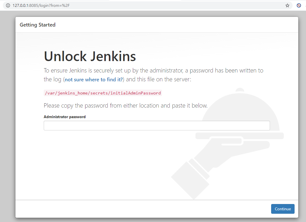 저는 위에서 host port를 8085 port 로 설정하였기때문에 127.0.0.1:8085로 접속하면 아래와 같이 jenkins console 화면이 접속 됩니다.